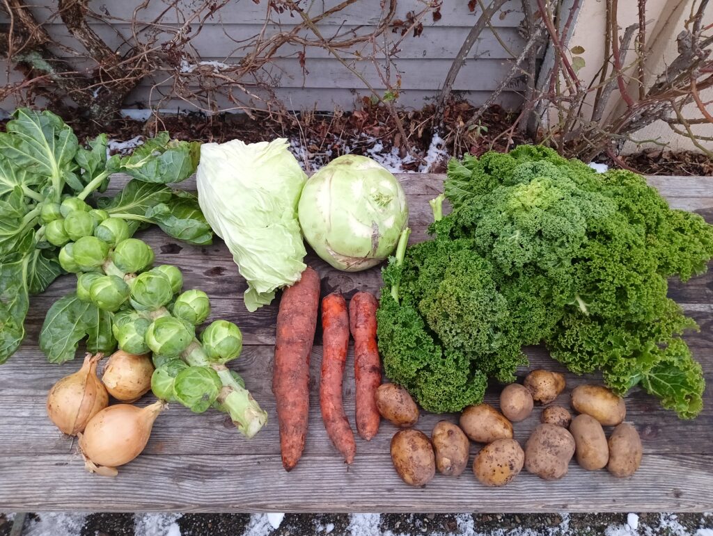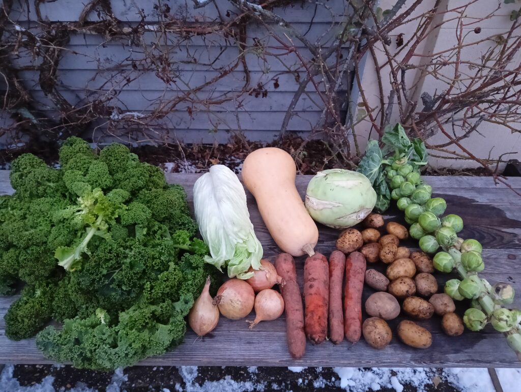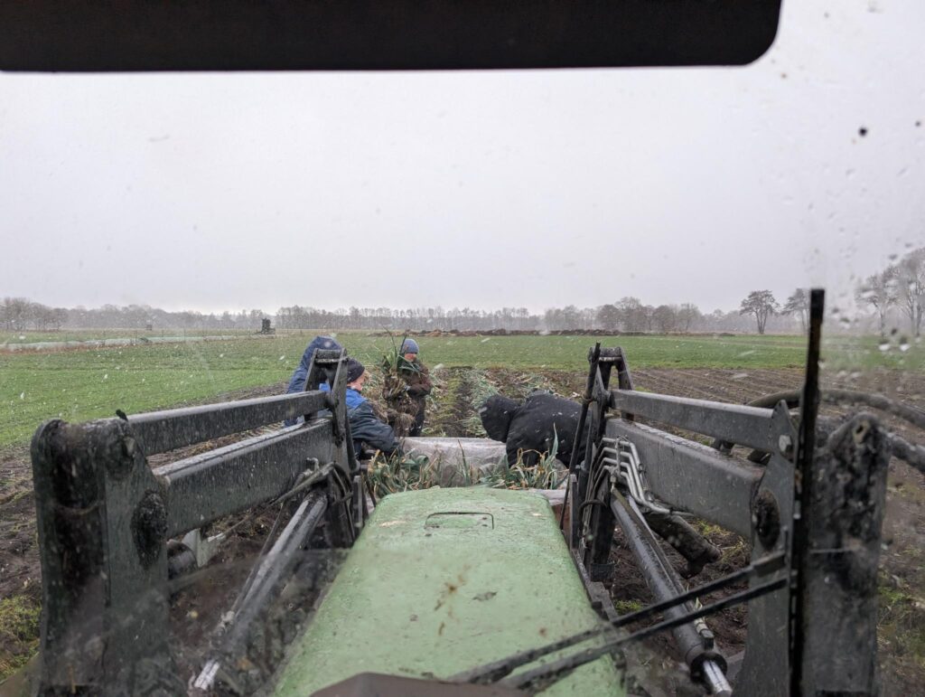 Im Laufe des Wochenendes hat sich die Wettervorhersage auch etwas geändert hin zu weniger tiefen Temperaturen. Trotzdem war es wichtig, das Gemüse vorzuernten, da wir Grünkohl nicht unter einer Schneedecke ernten oder Porree aus gefrorenem Boden ziehen können.