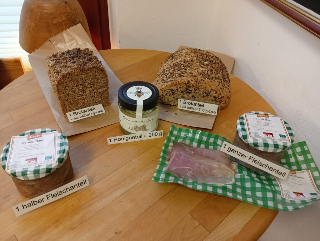 Diese Woche gibt es für die ganzen Anteile ein Glas Corned Beef und eine Packung Schweineschinken.