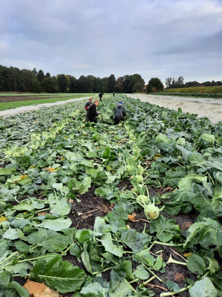 in der vergangenen Woche haben wir reichlich Kohlrabi für euch geerntet und eingelagert. Bei dem relativ warmen Wetter ist der Kohlrabi weiter prächtig gewachsen, sodass wir einen super guten Ertrag eingefahren haben. Der „Kossak“-Kohlrabi ist bis zu 1,5 kg schwer geworden ! Daher wird es diesen Winter reichlich von unserem heimischen Kohlrabi für euch geben, während ihr in Bioläden und anderen Geschäften nur noch Kohlrabi aus Italien finden werdet. Da wir so viel mehr geerntet haben als geplant, bieten wir ihn aber auch Schulküchen und Mensen in der Region an …