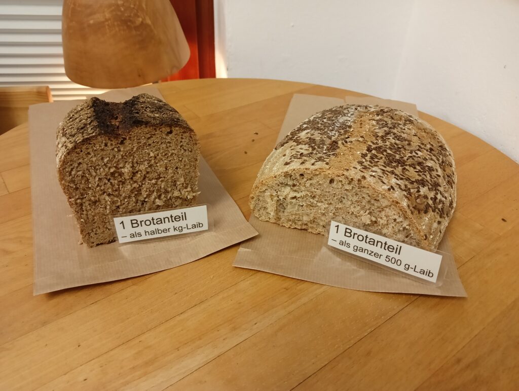 Diese Woche gibt es Roggenkastenbrot (1000 g) und Dinkelkrustchen (500 g), die ihr frei miteinander kombinieren könnt. Wer nur einen Brotanteil hat, kann sich natürlich auch ein halbes Roggenbrot nehmen 😉.