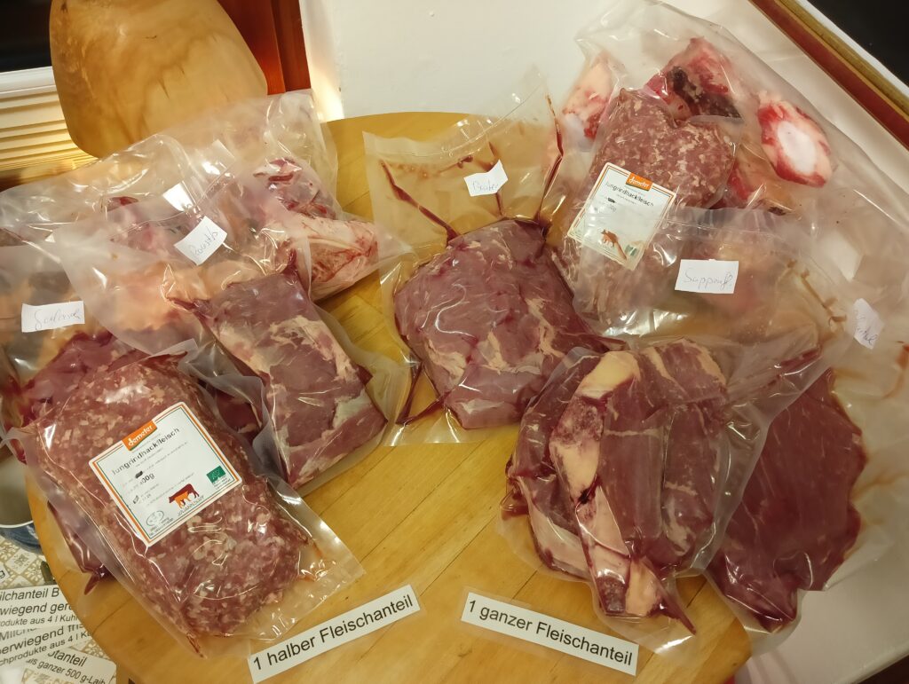 Aus unserem Projekt der muttergebundenen Kälber-Aufzucht verteilen wir diese Woche die wunderbaren Fleischpakete vom eigenen Jungrind. Es ist richtig klasse, dass mit euren Fleisch-Anteilen und den zusätzlichen Bestellungen über Märkte und Hofkiste jedes Gramm Fleisch verkauft ist !