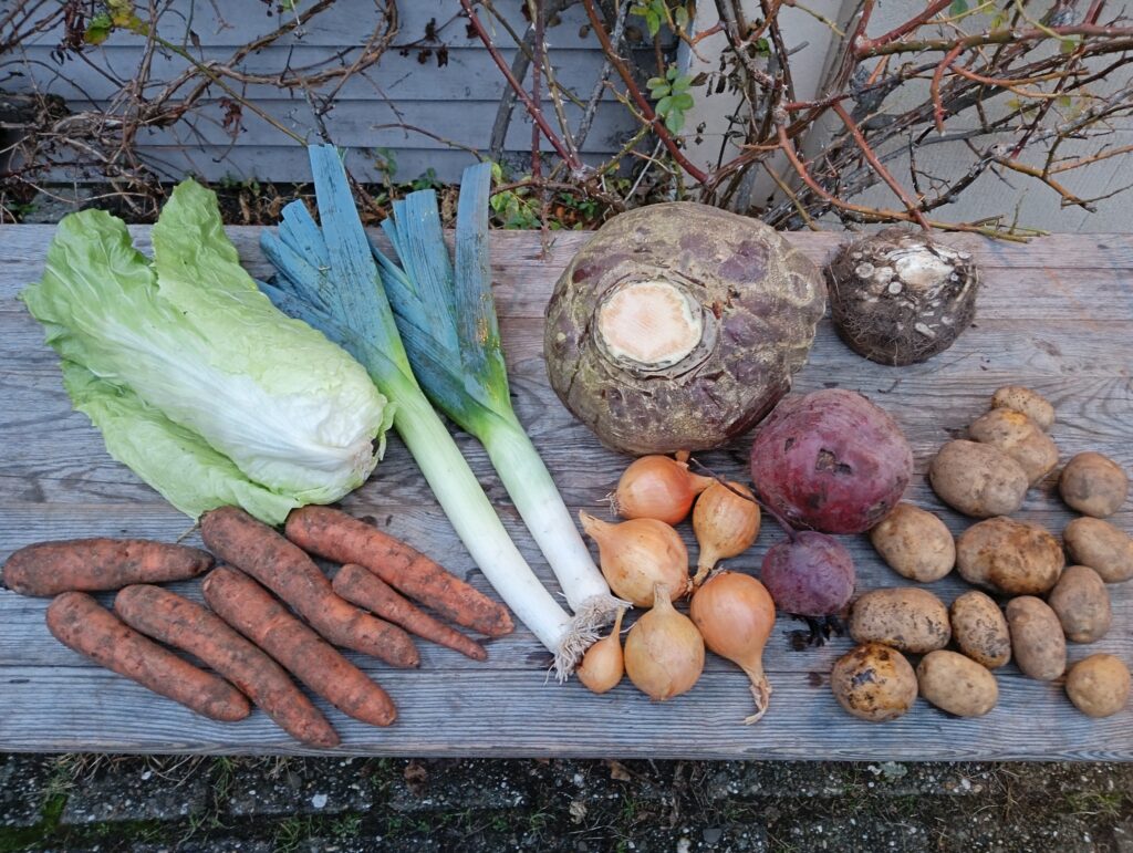 Diese Woche gibt es schon einen richtigen Winteranteil mit reichlich schönem Lagergemüse wie Rote Bete, Sellerie und Steckrüben. Frisch vom Acker holen wir für euch den Zuckerhut-Salat und schöne große Porree-Stangen. Zuckerhut kann übrigens – in Zeitungspapier eingeschlagen – gut im Keller oder Schuppen – kühl und frostfrei – auch mehrere Wochen gelagert werden.