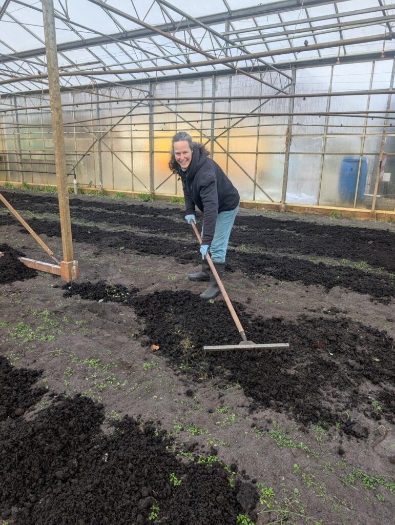Stefanie verteilt den Kompost mit der Harke, während Insa, Torsten und Manuel mit der Kreiselegge durch das Gewächshaus fahren und den Kompost in den Boden einmischen.
